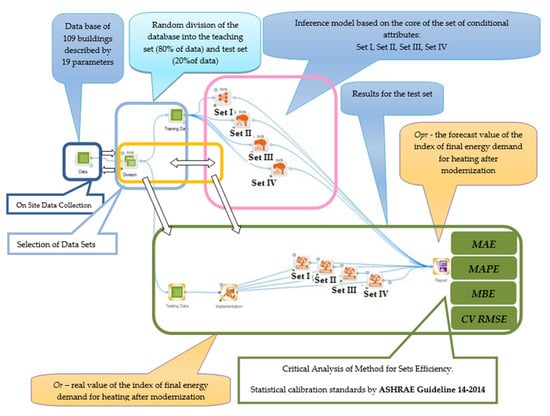 In the first part of the prediction model construction, the database was randomly divided into a teaching set and a test set. The input data characterizing the buildings were then divided into groups of variables Set I to Set IV. For individual groups from the learning set, the reducts and the core of the set of attributes were determined, which were used to create an inference model. The built model was subjected to a critical analysis (on the test set) in terms of accuracy and quality of the built forecast. The working space, on the basis of which the analyses were performed, is shown in Figure 2.