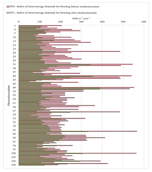 Index of final energy demand for heating of buildings is very varied. In buildings before modernization, it was between 83–569 [kWh·m−2·year−1], while after the improvement, it was 51–389 [kWh·m−2·year−1].