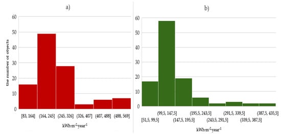 Nearly half of the buildings before the thermal modernization were characterized by energy consumption in the range 164–245 [kWh·m−2·year−1]. In the group of improved buildings, the largest group is made up of buildings where the energy demand for heating is between 99–147 [kWh·m−2·year−1].