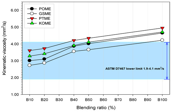 Figure 4 depicts the effects of the blending ratios on the kinematic viscosity of POME, GSME, PTME, and KOME. For lower percentage blending of B10 and B20, all biodiesels fulfilled the limit range set by ASTM D7467 of 1.9–4.1 mm2/s. Hasan and Rahman [69] also observed the same trend in their review. At B40 and above, PTME and KOME failed to meet the range limit. This limit range is for blends of B6−B20 only.