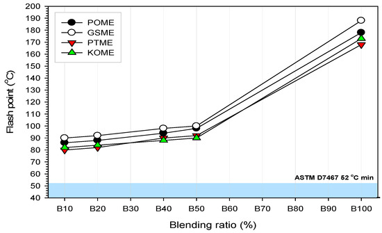 - All of the biodiesel blends exceeded the minimum flashpoint requirement for the ASTM standard, which means all of them are safe for use. Furthermore, GSME exhibited the highest flashpoint for all blend ratios.