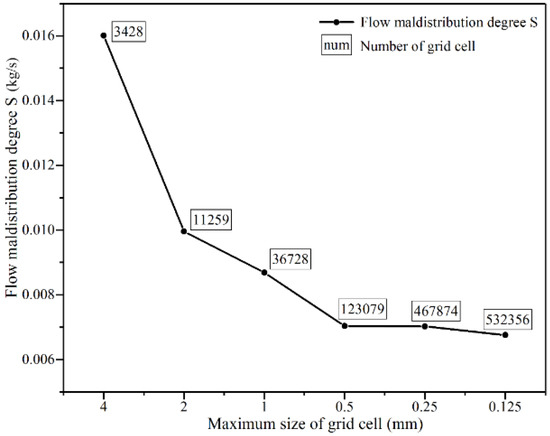 In the following flow simulation analysis, the inlet duct and outlet channels were the same as the header in Reference [22]. The conservation equations of mass, momentum, and energy were solved using the finite volume method with the SIMPLE pressure-velocity coupling algorithm based on the standard k ε model. Boundary conditions contained the inlet velocity and temperature of air, which were 14.6 m/s and 300 K. The dissipation rate of turbulent was 3.8%, and the walls were adiabatic with no slips. The convergent condition was specified as when the absolute residuals were lower than 10−5. The grid number of the computational domain had a very important influence on the accuracy of results. The accuracy can be improved with an increase in grid number, while the computational complexity and computational time were also increased. To determine the optimum grid number, a series of grid independence tests were implemented to determine the optimum grid number. The total number of grid and corresponding calculated flow maldistribution degree under different maximum sizes of grid cells are shown in Figure 4.
