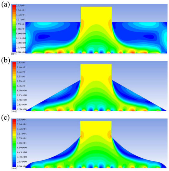 Figure 7. Velocity contours in the inlet header: (a) Direct transition duct; (b) triangle transition duct; (c) quasi-parabola transition duct.