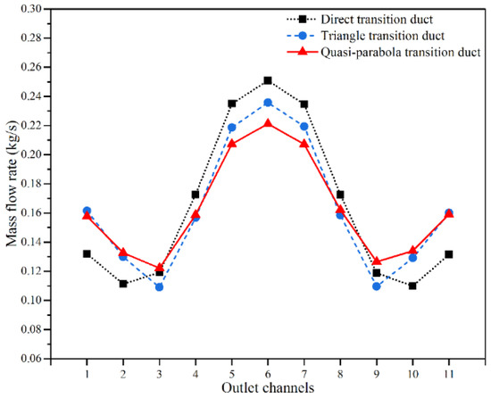 Figure 7 shows the velocity distribution in the inlet header with different transition ducts. The mass flow rates at outlet channels under the three transition ducts are shown in Figure 8. There was a mutation between the equivalent diameters of the direct transition duct and the outlet channels of the header, two reverse flow regions were formed, and the flow maldistribution degree reached 0.0543 kg/s. The reverse flows can be decreased using the triangle transition duct and quasi-parabola transition ducts. Compared with the triangle transition duct, the velocity gradient was smoother, and the velocity mutation was less using the quasi-parabola transition duct. Results indicate that the difference between the maximum and minimum mass flow rates was decreased and the flow maldistribution degree of quasi-parabola transition duct was 0.0348 kg/s, which was 78.6% of the flow distribution degree in the triangle transition duct. Therefore, the quasi-parabola transition duct was applied in the following improved inlet header.