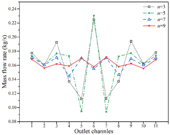 Figure 10. Mass flow rates at the outlet channles under different odd numbers of splitter plates.