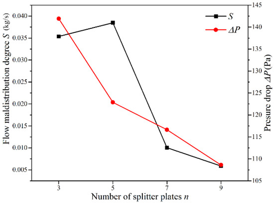 The mass flow rates at outlet channels under different odd numbers n = 3, 5, 7, and 9 of splitter plates were calculated and listed in Figure 10. The corresponding flow maldistribution degrees and pressure drops are shown in Figure 11. When the number of splitter plates increased from 3 to 5, the flow maldistribution degree S increased from 0.0354 kg/s to 0.0385 kg/s because the air flow velocity in the central region was suddenly increased. As the number of splitter plates increased from 5 to 9, the flow maldistribution degrees S were 0.0385 kg/s, 0.01005 kg/s, and 0.0059 kg/s, respectively. The flow maldistribution degrees were decreased because the air flow velocities in the direction of length L were increased, which can decrease the flow maldistribution. If n was further increased to 11 or more, the distance between adjacent splitter plates will be too small to manufacture due to the size limitations of inlet header. Therefore, the optimum number of splitter plates was n = 9 when considering the influences of flow maldistribution, pressure drop, and structural constraints simultaneously.