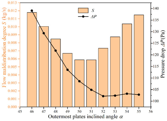 The inclined angle of the outermost splitter plates α has an important influence on the angles of other splitter plates and the air flow condition in the header. Therefore, the air flow simulations with different α [ 46 , 55 ] were implemented in Fluent, and the other parameters were determined as H = 100 mm, h = 30 mm, and n = 9. The flow maldistribution degree S and pressure drop Δ p are shown in Figure 12. The pressure drop was decreased as the increase of inclined angle α . As inclined angle value α increased, the transverse flow effect was improved, the mass flow rates at both sides of outlet channels were increased and the flow maldistribution degree S was decreased. However, when the inclined angle value α was too high, the transverse flow effect was very serious, the mass flow rates in middle region of outlet channels were low, and the flow maldistribution degree S was also increased. The minimum value of S was 0.005876 kg/s at α = 50 and α = 51 . The pressure drop Δ p at α = 51 was 104.9 Pa, which was smaller than 108.6 Pa at α = 50 . Therefore, the optimum inclined angle of the outermost splitter plate was α = 51 .
