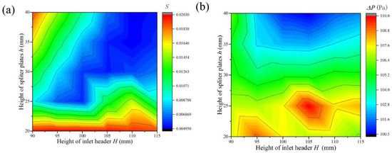 Table 1 and Table 2 list the flow maldistribution degrees S and pressure drop Δ p under multiple different combinations of inlet header height H [ 90 mm , 115 mm ] and splitter plate height h [ 20 mm , 40 mm ] . The other structural parameters were n = 9 and α = 51 . The corresponding contour maps of flow maldistribution degrees and pressure drops are shown in Figure 13.