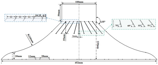 The flow maldistribution of MPFHE is mainly related to the construction of inlet header. A schematic diagram of the conventional header (denoted as Configuration A) is illustrated in Figure 1, in which the length L and radius R of the inlet header are 452 mm and 77 mm, respectively. The fluid flows from the small inlet flow pipe with diameter D = 100 mm into the header straightforwardly, and then flows to fin channels through multiple outlet channels of the inlet header. There is serious flow maldistribution using the conventional header (Configuration A), where the outlet velocity and mass flow rates in the middle region are higher than both sides at the plane of outlet channels. Therefore, an improved inlet header with splayed perforated wing panels (denoted as Configuration B) was proposed by Yang [22], as illustrated in Figure 2. The fluid flows through the small holes on the wing panels, which can decrease the velocity in the central region and increase velocities at both edges of the header, thereby improving the flow distribution.
