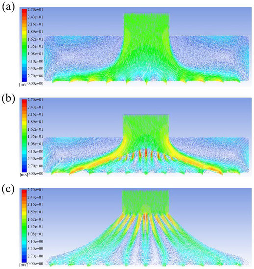 Figure 15. Velocity distribution in the inlet header under different configurations: (a) Direct transition duct; (b) triangle transition duct; (c) quasi-parabola transition duct.