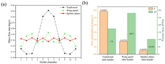 Figure 16. Comparison results: (a) Mass flow rates; (b) flow maldistribution degree and pressure drop.
