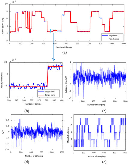 From Figure 3, it is apparent that the tracking effect of the MPC algorithm is satisfactory, and the maximum error of output power is 2.8 kW for the wind farm. As presented in Figure 3c and Figure 4c (the local zoom of Figure 3a and Figure 4a), it is apparent that the output active power from the results derived by the MMPC method is more smooth than that yield from the single MPC method. In comparison, the MMPC can derive a much smaller output error under the same model switch strategy shown in Figure 3e or Figure 4e. The maximum active output error using the single MPC is almost 3 kW (in Figure 3c), while that yield from MMPC is about 2kW (in Figure 4c). It is mainly because that the proposed adaptive multi-model switching predictive control method can switch to different models according to the wind speed variation, which can ensure the wind generation system operates in an optimal condition by selecting the most suitable model given in Figure 1. For the single MPC method, however, there is no additional choice but to adapt to the variation of the wind speed and tune the control parameters according to the predicted control error. Since the wind speed sometimes varies rapidly in a very short time, the performance of the MPC method becomes inferior when compared with the MMPC method.
