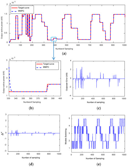 Simulation results using the MMPC. (a) The output power of wind farm using MMPC; (b) local zoom of (a), (c) output power error between the target curve and control output, (d) control incremental of the single MMPC, (e) model selection during the control process.