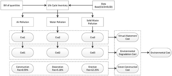 According to the Guideline for Chinese Environmental and Economic Accounting [5] and the characteristics of construction engineering, the environmental costs of buildings are divided into three parts: (1) green construction measures cost, which refers to the practical costs of protecting the environment during construction stage; (2) virtual abatement costs, which are used to control the emissions of pollutants in the life cycle of buildings, including water pollutants, air pollutants and solid waste pollutants, and where Cva1, Cva2 and Cva3 are the virtual abatement costs of air pollution, water pollution and solid waste pollution, respectively; (3) environmental degradation cost, which is the environmental loss cost caused by the emission and pollution of buildings, where Ced1, Ced2 and Ced3 are the environmental degradation costs of air pollution, water pollution and solid waste pollution, respectively.