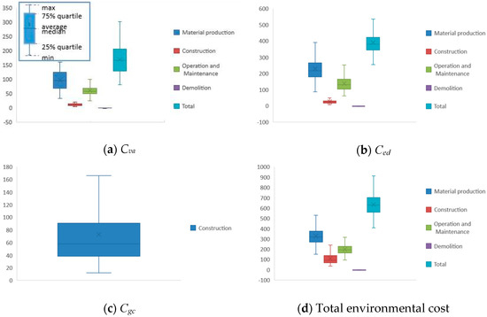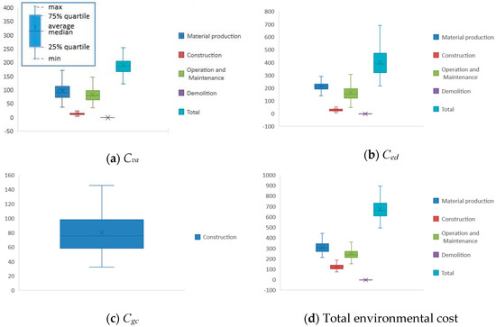 Figure 3 and Figure 4 show that the added variability did not significantly change the average values nor did it change the ranking of the four stages in terms of Cva, Ced and Cgc. The minimum, average and maximum total environmental costs are 412, 616 and 827 CNY/m2, respectively, in the Xiamen case study building, while they are 489, 673 and 899 CNY/m2, respectively, in the Beijing case study building. The coefficient of variation of the material production stage is the largest, followed by the operation and maintenance stage, while that of the demolition stage is the smallest.