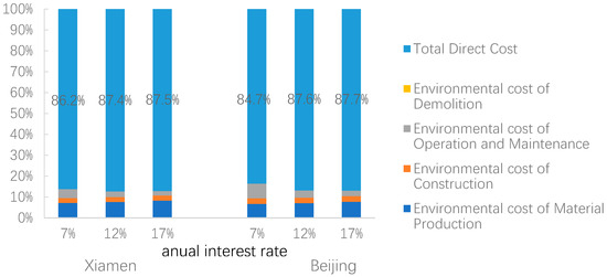 - The environmental costs of residential buildings in Beijing and Xiamen are 679 CNY/m2 and 640 CNY/m2 respectively, of which the biggest contributor is material production, followed by operation stage, construction stage and demolition stage.