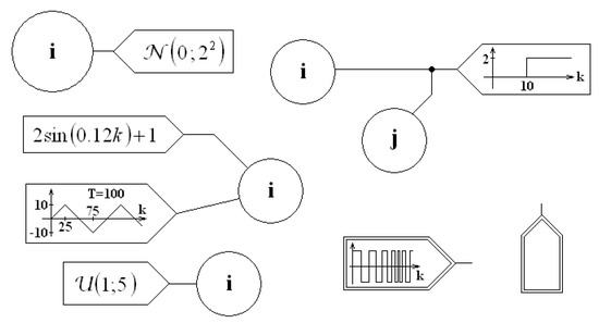 One state variable can have more than one input signal. If it is not obvious that the signal is periodic, one should insert information about the period length (in time steps), e.g., “”. If all information about the input signal cannot be presented on the scheme, a double “input figure” should be used (examples are presented in Figure 3 on the right side).