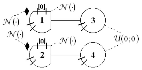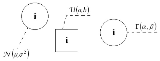 The type of internal noise also should be presented on the scheme, or optionally, it should be described in the text. The PDF type with parameters should be connected to a specific node by a dashed line. Examples are presented in Figure 4.
