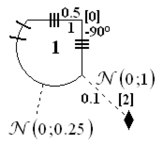 The subsequent object was used in [36] and is described by Equations (40)–(42). The description, using the proposed designations, is presented in Figure 7. As one can see, parameter was used on the scheme to obtain “sin” instead of “cos” from Equation (17).
