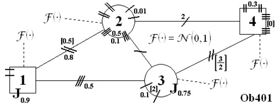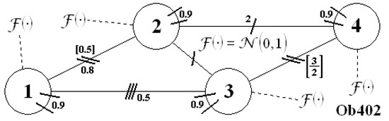 The last object, which is mentioned below, was used in [38]. It is a tracking system, and its state-space model is given by Equation (46). The first two variables (, ) are coordinates; the other two (, ) are velocities; and the system scheme is presented in Figure 9. In the referenced article, the authors did not provide information about internal and measurement noises (it is only known that they were Gaussian). State variables and do not have internal noise, and this is why on the scheme, one can find “PDF” .
