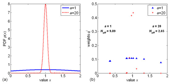 An example that shows the difference in weight values for measurement (). For , measured value was assumed to be one, and for , the measured value was assumed to be 20 (for better readability). (a) Exemplary probability density functions; (b) exemplary particles (with normalized weights) drawn from PDFs.