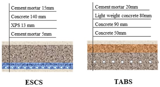 The output of a radiant system should vary with climatic change, and the hydronic system has variable water flow rate but constant supply temperature. For considering the effect of thermal mass surrounding a hydronic system (the concrete slab acts significantly as a regenerator in TABS [35]), the embedded surface cooling system (ESCS) is only selected to determine the significant effect of thermal mass in the external walls on the heat transfer and transmission load in the zone with a radiant system.