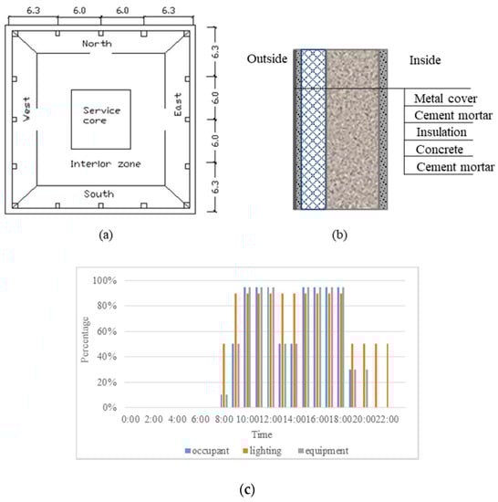 Building information. (a) The plan of a standard floor, (b) external wall construction (from outside to inside), (c) scheduling of internal heat gains in the building (heat gain from occupants: 12 W/m2; heat gain from lighting: 13 W/m2; heat gain from equipment: 20 W/m2).