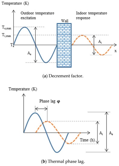 The decrement factor is a dimensionless factor which describes the change in amplitude of a sinusoidal heat transfer through a building component (Figure 4a), and it is generally expressed by the ratio of amplitude of temperature excitation to the value of response (Equation (10)) [26].
