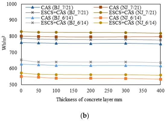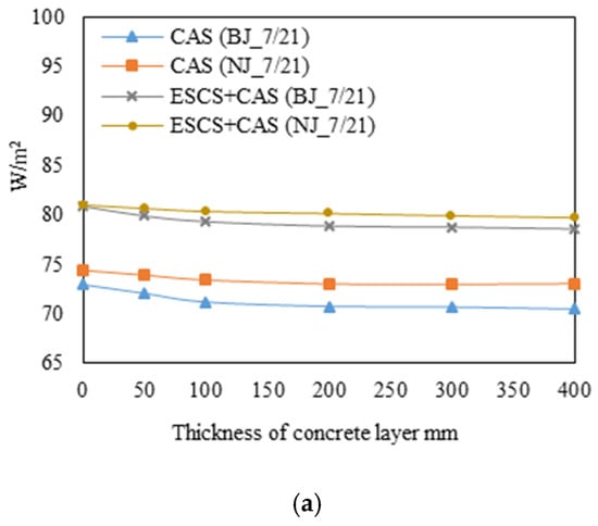 Preceding research [13,14,15,16,17,20] indicated that the insulation layer should be placed inside when the cooling system runs intermittently. Thus, the external wall structure can be rearranged (i.e., outside concrete + inside insulation). The corresponding thermal mass performances are discussed based on identical thermal environments in the same office building equipped with the combined system. The peak sensible cooling load decreases by approximately 2% to 3% as the thickness of the concrete layer extends from 0 to 200 mm, whereas the corresponding accumulated cooling loads for 24 h change minimally as the thermal mass increases.