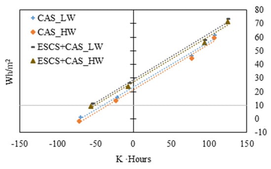 In addition, the peak cooling load of the zone with an ESCS is higher than the load of the zone with an equivalent CAS by 9% to 11%, and the accumulated load is also higher by 3%–4% based on same weather conditions. As Figure 7 illustrates, accumulated conduction heat gain through an external wall with a heavy thermal mass in the zone with an ESCS is still more than the amount on the wall with a lightweight structure in the zone with an equivalent CAS when the degree-hours are selfsame. These results are basically consistent with the findings from the laboratory experiment conducted by Woolley et al. [49]. The tests were carried out in a standard climatic chamber, and two separated tests were implemented side-by-side: one with a radiant cooling ceiling, and the other with an overhead mixing air distribution system. The results showed that the peak cooling load of the radiant system was 2%–10% larger than the load of air system in the case where internal heat gain varied periodically, and the accumulated load was 2%–7% higher. The experiment also confirmed the differences existing in heat transfer processes between the zones with and without a radiant system, but it did not explain the effect of thermal mass further.