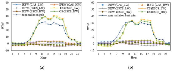 Radiation heat gain in north perimeter zones. (a) Radiation heat gain on Beijing cooling design day, (b) Radiation heat gain on a typical Nanjing day in transient season. (IFEW—inside face of external wall, CS—cooling ceiling.)