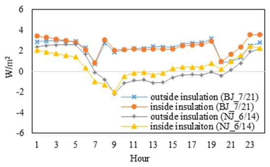 On a typical Nanjing day in June, more conduction gain exists on the external wall with inside insulation during the occupied period compared to the gain of the wall with outside insulation (Figure 12), because little internal heat gain is absorbed by the inside insulation layer, and the portion distributed to the external wall immediately becomes the cooling load through convection and radiation heat transfers. In a typical office building, internal heat gain from occupants, lighting, and electrical equipment accounts for 60% or more of the total gain. Correspondingly, the inside face temperature on a wall with inside insulation is higher than that of the wall with a massive layer inside, most times, on the typical day in June. Although the temperature falls down after midnight, and the corresponding conduction gain decreases and becomes less than the gain on the surface with a massive inside layer, it cannot compensate the excess gain from 09:00 to 23:00 during the day. Therefore, the structure (outside massive layer + inside insulation) has little positive impact on the saving of heat transmission. The accumulated conduction gain on the inside face is close or even higher than the amount on the surface without concrete layer when the degree-hours are absolutely the same.
