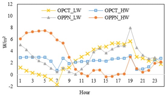 Generally, a cooling source with a relatively higher temperature can be utilized by a radiant system, and the entire system coefficient of performance (COP) is expected to be better than a conventional CAS. The present authors investigated a practical TABS operation, and found that the supply water temperature can increase to some degree to maintain the indoor environment at an acceptable comfort level by utilizing the thermal mass and prolonging the radiant system operation time [35]. In addition, from the performances on the typical days in the transient season, the transmission loads caused by an outdoor environment are not as much as the loads on the cooling design days, and the heat transfer in the inside massive layer can be viewed as a process of cooling charging and discharging. Therefore, a potential system strategy, OPPN, could be tried in the zone with ESCS. In the strategy, the auxiliary CAS still runs continuously during the occupied period; the hydronic system starts at midnight and runs continuously with a constant flow rate until the end of the occupied period. The supply water temperature is set at a constant value according to the average outdoor temperature over 24 h and the hydronic system operation hours. Thus, the room operative temperature cannot stay constant but should be in an acceptable range.