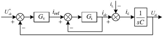 Therefore, the fluctuation degree of the bus voltage mainly depends on whether can track in time. It can be known that the value of is mainly controlled by the current inner loop (), and the current reference value () of the current inner loop is the output value of the voltage outer loop , according to Figure 4. As we all know, the traditional PI controller eliminates the fluctuation of the bus voltage based on the difference between the rated voltage and the real-time voltage of the bus. When the system is disturbed, the voltage difference will not change suddenly, because the voltage across the capacitor cannot be suddenly changed. Therefore, the PI controller based on error cannot respond quickly. This is the main reason why the dynamic response of the system is slow when PI controller is used in the voltage outer loop.