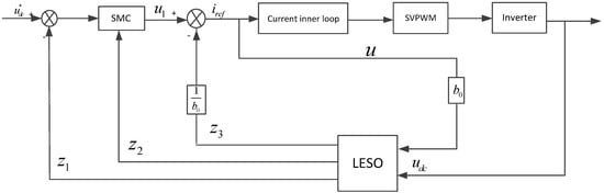 contains a switching function, so it also gives the illusion that cannot be differentiable, but the switching function is differentiable. Its differentiation is an impact function, and the differential of an impulse function is an impact even function. On the other hand, in the actual power system, there are inductance devices in the AC measurement, so there is no disconnection phenomenon. That is to say, if a more accurate mathematical model is established in the actual system, the differentiation of will be easier to know. The design of LESO does not need to know the specific expression of , but only needs to know that can be differentiated.
