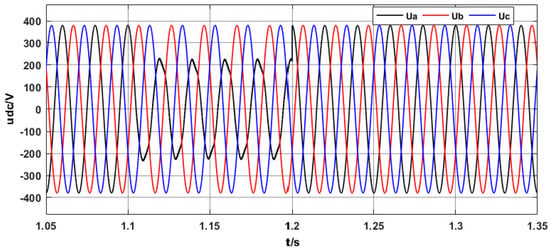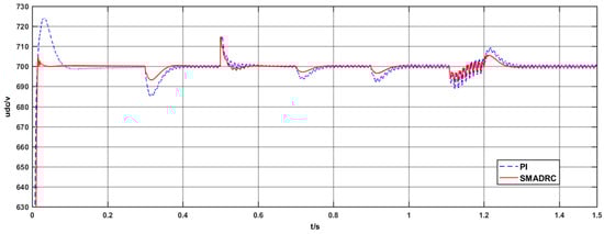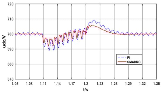 At 1.1 s, the three-phase voltage is not symmetrical and, at 1.2 s, the three-phase voltage becomes symmetrical three-phase voltage again. Figure 12 shows the waveform diagram. Figure 13 shows the corresponding bus voltage. It can be seen from Figure 13 that the SMADRC controller has better robustness than the PI controller when the three-phase imbalance occurs in the AC power supply. When the three-phase imbalance disappears, the SMADRC controller can return to the equilibrium point faster.