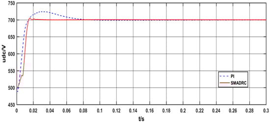 Figure 9 shows the waveform change of the bus voltage in the DC distribution network during the start-up of the AC-DC converter. On the one hand, as we all know, the value of the proportional gain affects the speediness and overshoot of the PI controller. The larger the proportional gain is, the better the speediness and overshoot of the system will be. It can be seen from Figure 9 that the rise time of the system under the control of the two controllers is the same, but the overshoot of the system under the control of PI controller is larger than that under the control of SMADRC. If we want to continue to improve the rise time of the system under the control of PI controller, we need to increase the proportional gain, but this will cause the overshoot of the system to become larger. On the other hand, it can be seen from Figure 9 that, when the bus voltage of DC distribution network under SMADRC control reaches the rise time, it will quickly stabilize near the rated voltage, but the system under PI controller control will need a long transition process to stabilize near the rated voltage. In conclusion, the AC-DC converter that is controlled by SMADRC has better starting performance and transient performance.
