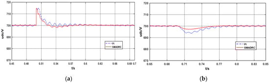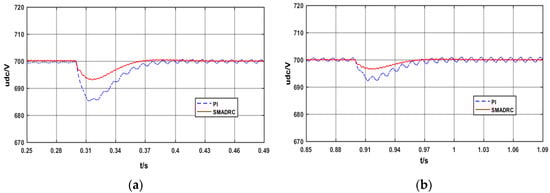 At 0.5 s, the photovoltaic is connected to the power grid and, at 0.7 s, the light intensity changes from the original 1000 W/m2 to 100 W/m2. The corresponding bus voltage diagrams are Figure 11a,b, as in Figure 10. It can be seen from Figure 11a that, when the PV is connected to the grid, the SMADRC controller has slightly better control performance than the PI controller. However, when the light intensity suddenly decreases, the SMADRC controller’s control effect is much better than the PI controller. The maximum bus voltage fluctuation under SMADRC controller is approximately half of the PI controller. Accordingly, when compared to PI controllers, the SMADRC controllers are more suitable for distribution networks with distributed power.