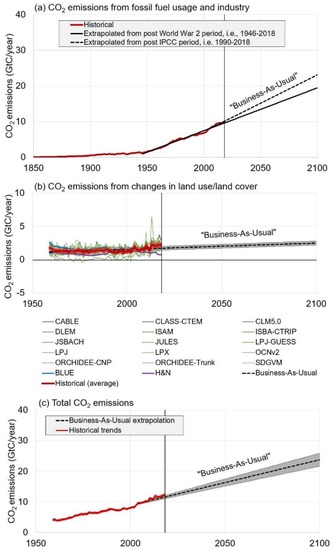 There is a second source of indirect CO2 emissions that is human-caused, however. These are emissions which occur from changes in land use or land cover, e.g., deforestation. Unfortunately, these indirect emissions are rather hard to quantify, and there are multiple different estimates, e.g., refs. [41,49,50,51,52]. We had initially considered just using one of the more widely cited of these estimates for extrapolating future emissions from changes in land use/land cover under BAU. However, often these estimates imply opposing trends, e.g., the Houghton and Nassikas (2017) [52] estimate implies that there has been a slight decreasing trend in annual emissions since 1997, while Hansis et al. (2015)’s “BLUE” estimate implies a slight increasing trend over the same period [50]. However, we note that Friedlingstein et al. (2019) have compiled both these estimates and 15 different model-based estimates for the post-1958 period as part of the “Global Carbon Budget” project [39]. Therefore, for our analysis in this paper, we have calculated the mean and standard errors of all 17 of these estimates. We then use a linear extrapolation of the upper and lower bounds of the error bars as our projection of BAU emissions from changes in land use/land cover up to 2100—see Figure 1b.