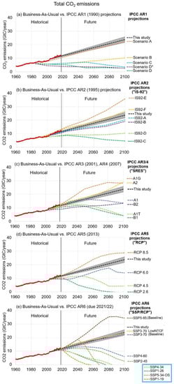 Comparison of the new “Business-As-Usual” projections of future total CO2 emissions with the various projections considered by the IPCC’s (a) 1st Assessment Report (AR1, 1990); (b) the 2nd Assessment Report (AR2, 1995); (c) the 3rd Assessment Report (AR3, 2001); the 4th Assessment Report (AR4, 2007); (d) the 5th Assessment Report (AR5, 2013); and (e) the upcoming 6th Assessment Report (AR6, due c. 2021/2022). The horizontal axes correspond to years. Details on the projections are provided in Table 2.