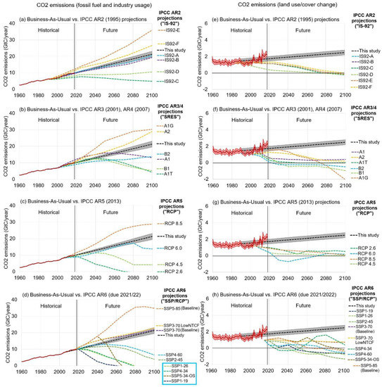 Comparison of the new "Business-As-Usual" projections of future CO2 emissions for (a–d) fossil fuel and industry usage and (e–h) changes in land use/land cover with the various projections considered by the IPCC’s Assessment Reports. Note that the vertical axes for (e–h) have a different scale than for (a–d). The horizontal axes correspond to years. Details on the projections are provided in Table 2.
