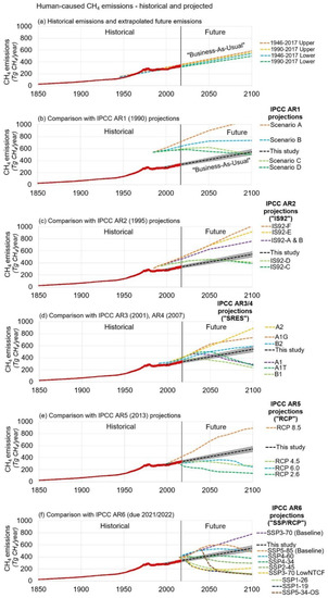(a) Historical and projected “Business-As-Usual” CH4 emissions. (b–f) A comparison of said Business-As-Usual projections to the projections considered by the various IPCC reports. The horizontal axes correspond to years. Details on the projections are provided in Table 2.