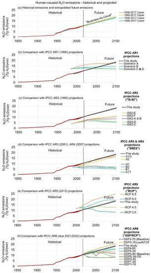 (a) Historical and projected “Business-As-Usual” N2O emissions. (b–f) A comparison of said Business-As-Usual projections to the projections considered by the various IPCC reports. The horizontal axes correspond to years. Details on the projections are provided in Table 2.