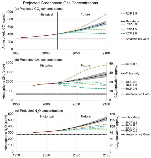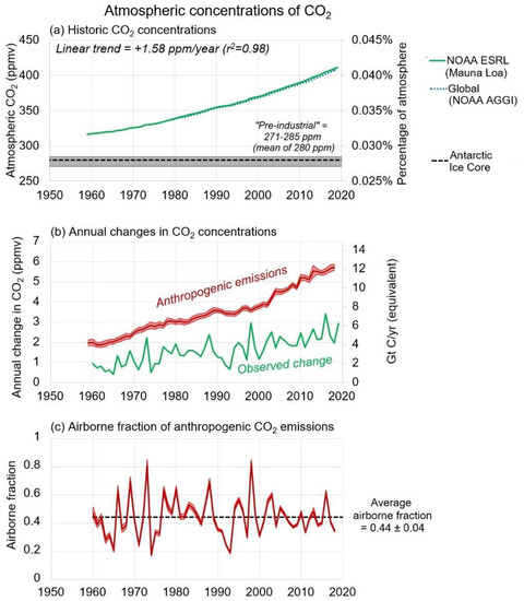 Figure 6a shows the observed annual atmospheric CO2 concentrations as recorded at Mauna Loa observatory in Hawai’i (solid green line) since systematic measurements began in early-1958 and also globally averaged estimates from multiple observatories around the world since 1979 (dashed blue line). Although the globally averaged curve is slightly below the Mauna Loa curve, they both almost overlap each other. Therefore, since the Mauna Loa record is longer, for the rest of this paper, we will treat it as being representative of “global atmospheric CO2 concentrations”. It can be easily seen that—as discussed earlier—atmospheric CO2 concentrations have been steadily rising at a rate of roughly ~1.5 ppmv per year since at least 1959, i.e., the start of the record. Antarctic ice core estimates of pre-historic atmospheric CO2 concentrations suggest that up until the 19th/20th centuries, concentrations had remained fairly constant since the end of the last glacial period more than 10,000 years ago [72], only fluctuating within the range 271–285 ppmv [38]. This small range of “pre-industrial variability” is shown by the grey band in Figure 6a, with the dashed black line corresponding to the mean value of 280 ppmv.