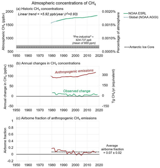 Antarctic ice core estimates of atmospheric CH4 before the instrumental record [38] suggest pre-industrial concentrations of less than half the current concentrations, i.e., 624–737 ppbv (0.624–0.737 ppmv) compared to ~1850 ppbv today [133]. Furthermore, during the 1980s, atmospheric concentrations were still rising. This led many researchers to suggest that anthropogenic CH4 emissions were significantly altering atmospheric concentrations of CH4 as well as CO2. Therefore, CH4 was included as one of the six greenhouse gases considered under the 1996 Kyoto protocol [18]. Indeed, as Ganesan et al. (2019) [134] note, attempting to reduce anthropogenic CH4 emissions is one of the main goals of the 2015 Paris Agreement [19]. However, during the 1990s and early 2000s, the rise in CH4 concentrations began to slow down and even plateaued for several years. It is only after 2006 that concentrations began to rise again. Over this entire period, anthropogenic emissions have continued and even increased—see Figure 7b.
