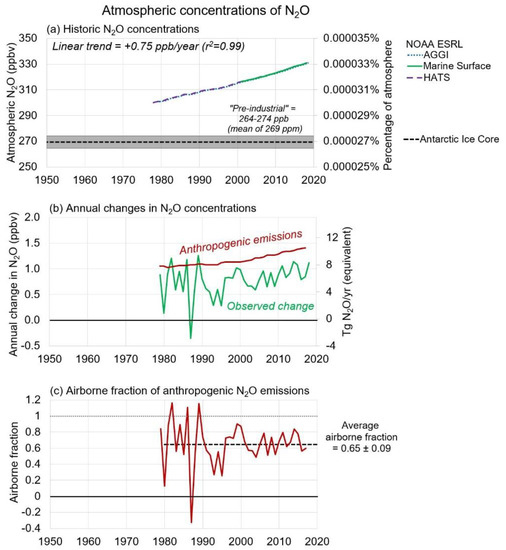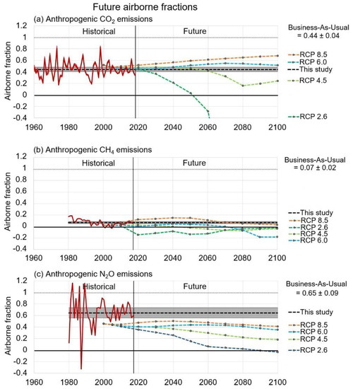 If Paradigm 3 is correct, then at least some of the observed increase in atmospheric CO2 over the Mauna Loa record is anthropogenic in origin, and therefore we argue that “business-as-usual” conditions imply that the airborne fraction will remain fairly constant. Within Paradigm 2, there is some debate over whether some of the sinks that are currently reducing the airborne fraction might become “saturated”, e.g., refs. [39,105,106,107,108,109]. However, given that the annual airborne fraction has remained fairly constant since the Mauna Loa record began in 1959, we will define “business-as-usual” conditions to mean this will remain constant with a mean of 0.44 ± 0.04. In Section 3.4, we will compare this assumption to the airborne fractions implicit in the IPCC RCP scenarios. But, first, let us consider the other two relevant gases.