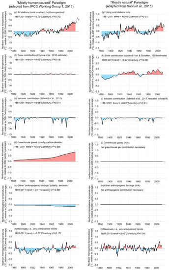 - Ring, M.J.; Lindner, D.; Cross, E.F.; Schlesinger, M.E. Causes of the Global Warming Observed since the 19th Century. Atmos. Clim. Sci. 2012, 2, 401. [Google Scholar] [CrossRef]
