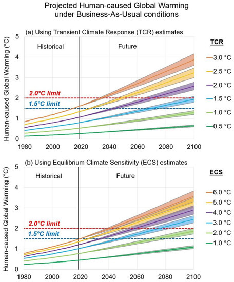 The selection of a specific “global average temperature” in °C as an international “goal” is a remarkably arbitrary and subjective process, e.g., see Mahoney (2015) [21]. Hence, there has been some debate over whether a target of 1.5 or 2 °C is better, e.g., [22,23,24,25], and whether or not such targets in terms of global temperature are helpful, e.g., [26,27,28,29,30]. However, there is a more fundamental question—what specifically should an individual nation do differently in order to “(keep) the global average temperature to well below 2 °C above pre-industrial levels (or even) 1.5 °C”? If the motivation of the Paris Agreement was to encourage individual nations to significantly alter their national policies relative to “Business-As-Usual”, then it is important to know how much Anthropogenic Global Warming to expect under “Business-As-Usual” conditions.