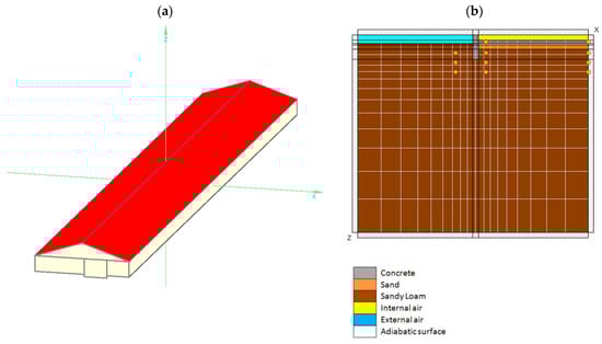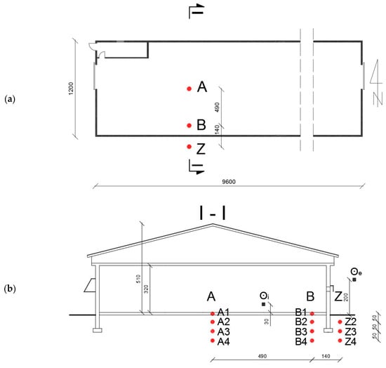 Broiler house model (a) and the grid of soil temperature measurement points (b).