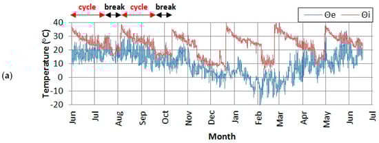 The breeding cycle at large broiler houses is usually 40 to 50 days long. The cycle length depends on the time necessary to reach the slaughter weight. The sanitation, mostly disinfection of the breeding hall, takes place after the breeding cycle. Taking into account technological interruptions lasting 7–14 days on average, there can be eight full production cycles in one year [,,]. Shortening the technological interruption is beneficial for thermal conditions in the initial period of breeding, because more heat accumulated in the soil during the previous cycle can be used to obtain appropriate thermal conditions in the birds’ living zone. The studies of the authors have shown that shortening the technological interruption to three days reduces the heating energy demand by 15% in comparison with a seven-day technological interruption. In addition, the extended technological interruption in the winter period extends the period necessary to heat the building and the floor. These relationships are important only when outdoor temperatures are low, particularly in winter. In Poland, technological interruptions can last even 21 days. With such long technological interruptions in the winter, the heating energy demand increases by 28% in comparison with a three-day technological interruption.